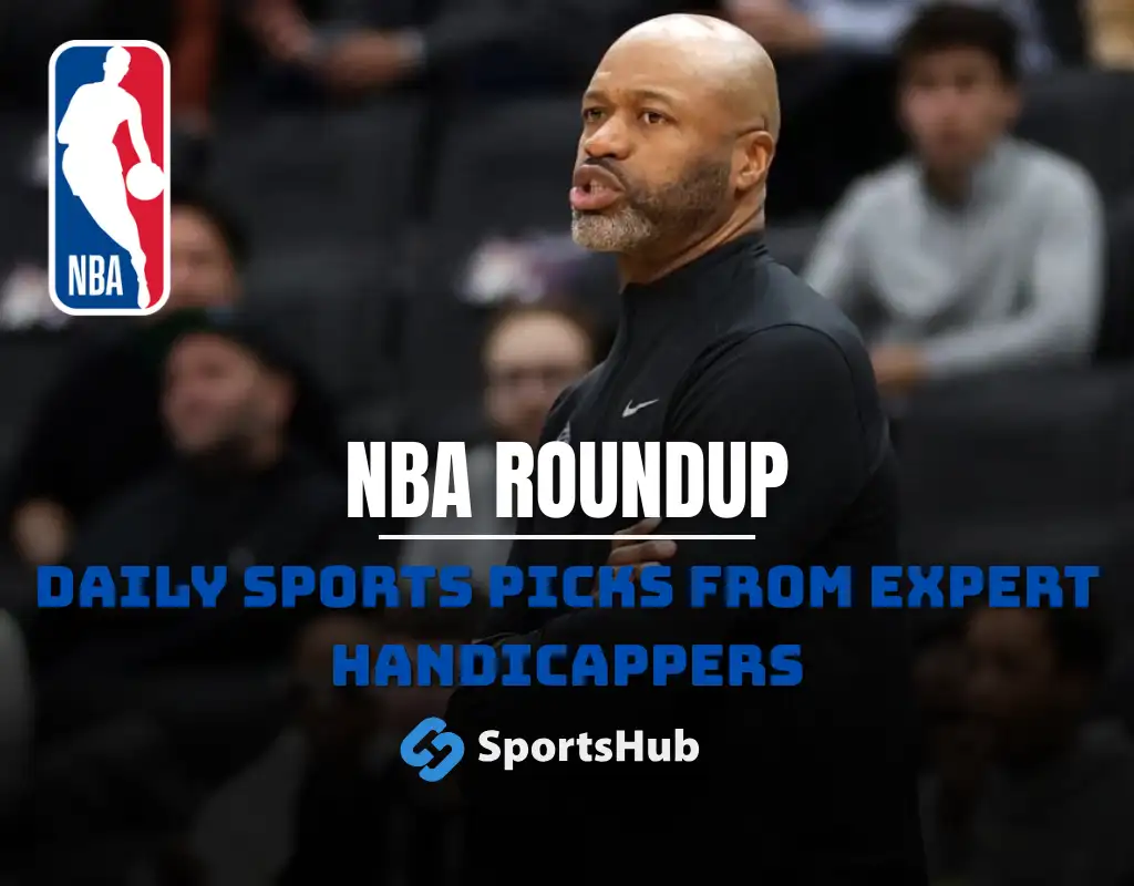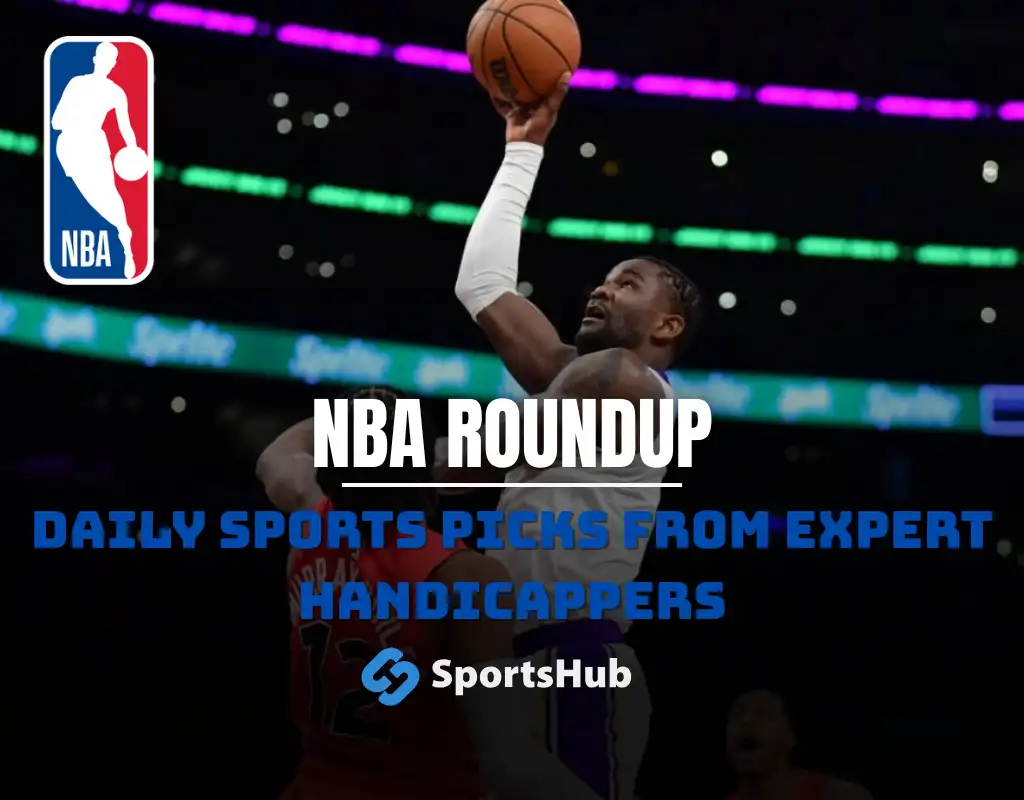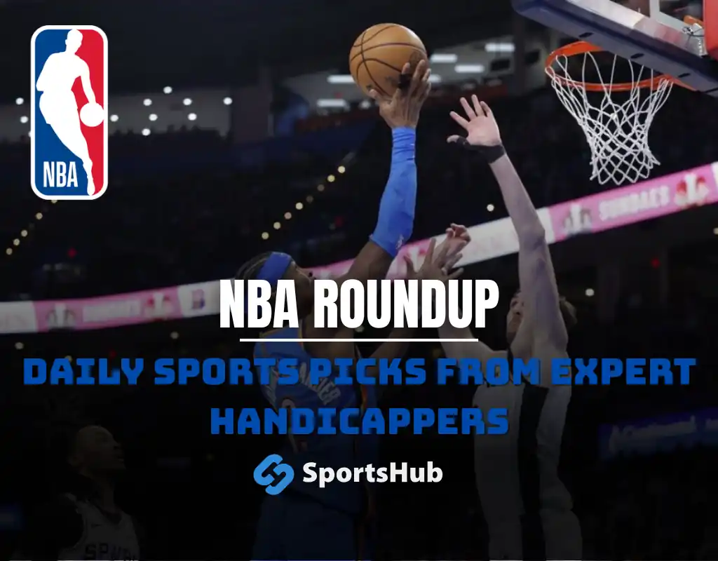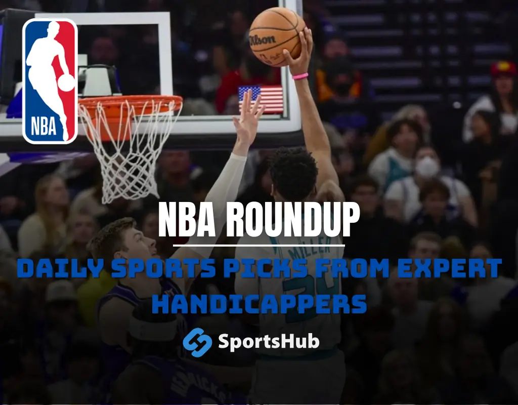 NBA roundup graphic with NBA logo and New York Knicks players Jalen Brunson and teammate on court with text promoting daily sports picks