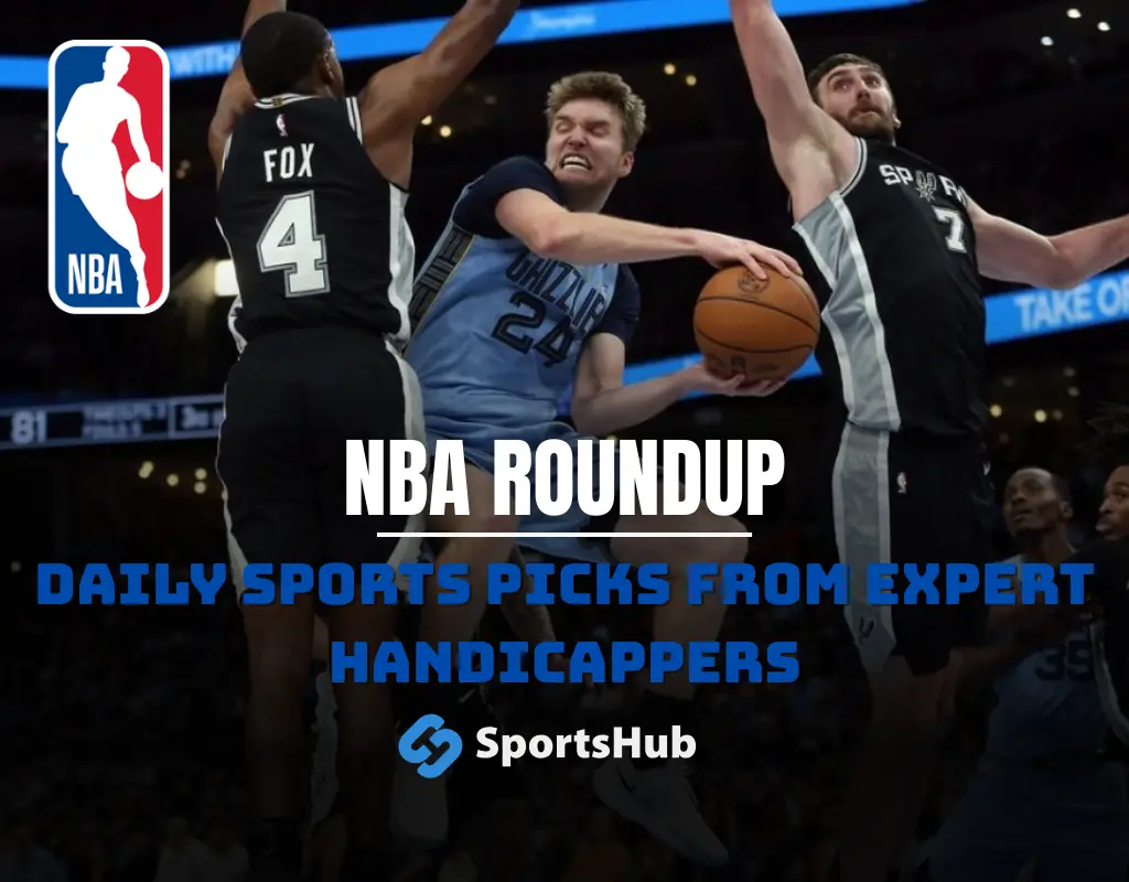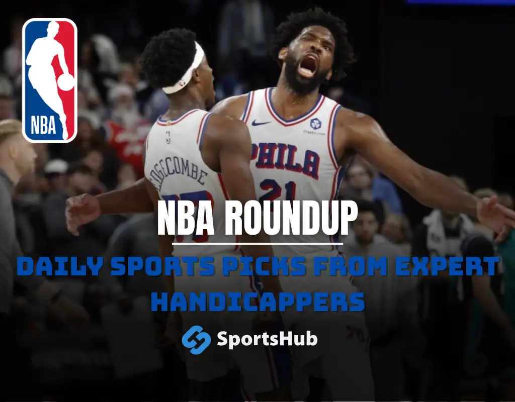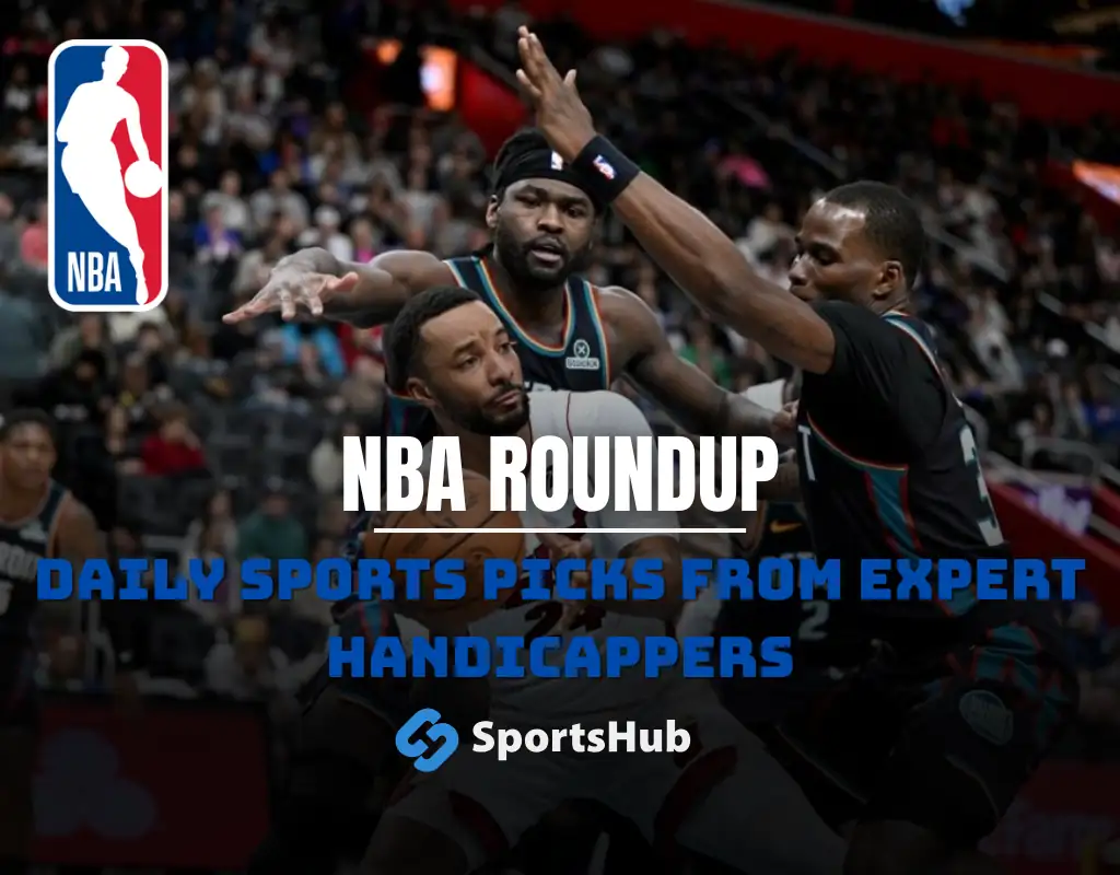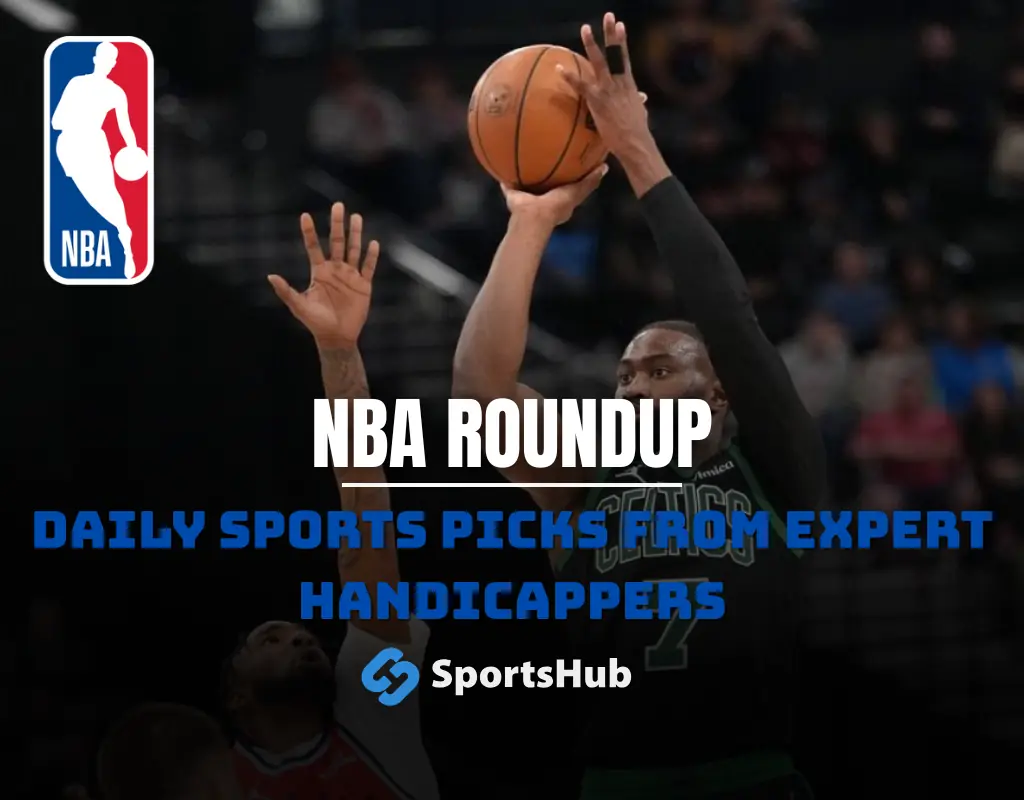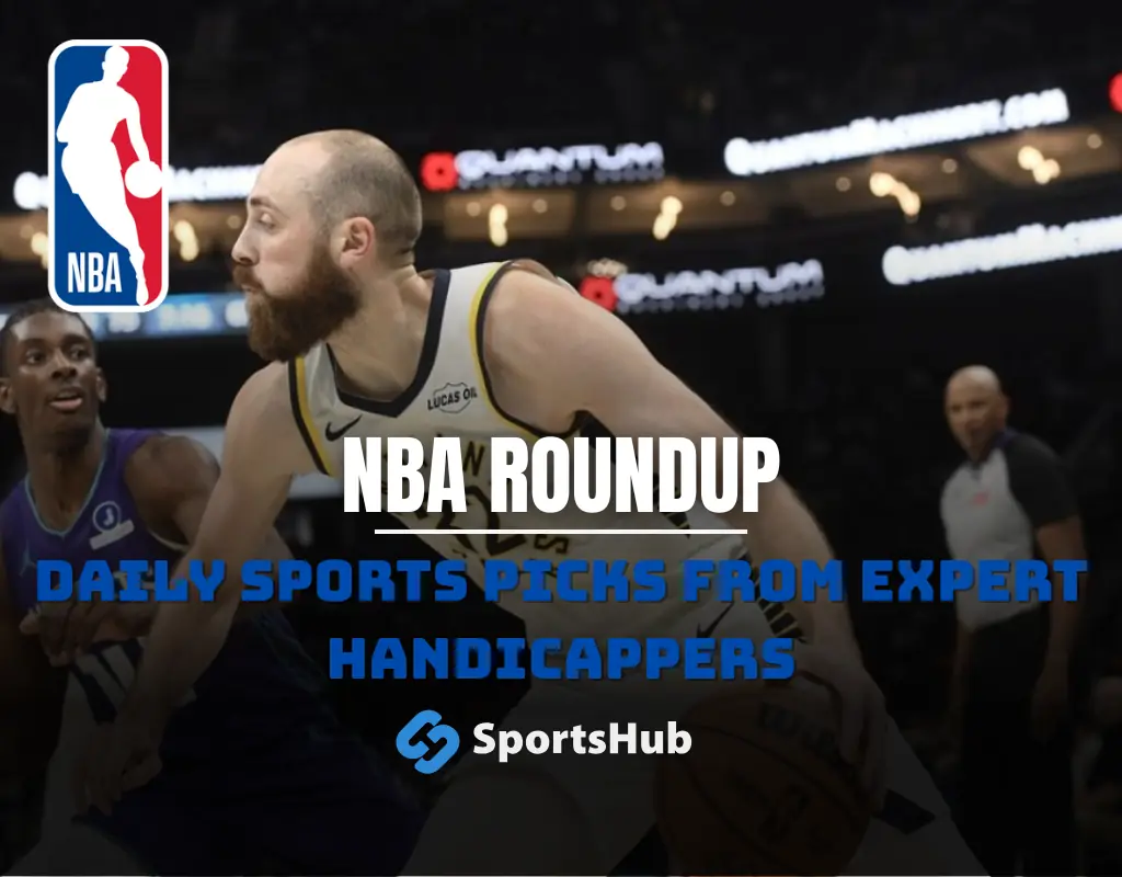 NBA roundup graphic featuring a Charlotte Hornets player with text NBA Roundup and Daily Sports Picks from expert handicappers