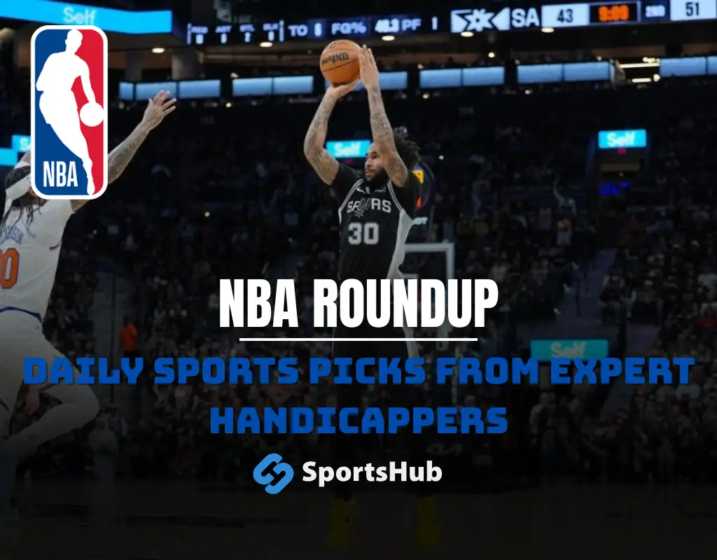 NBA player shooting a basketball during a game, with a text overlay promoting SportsHub's daily sports picks for expert handicappers.
