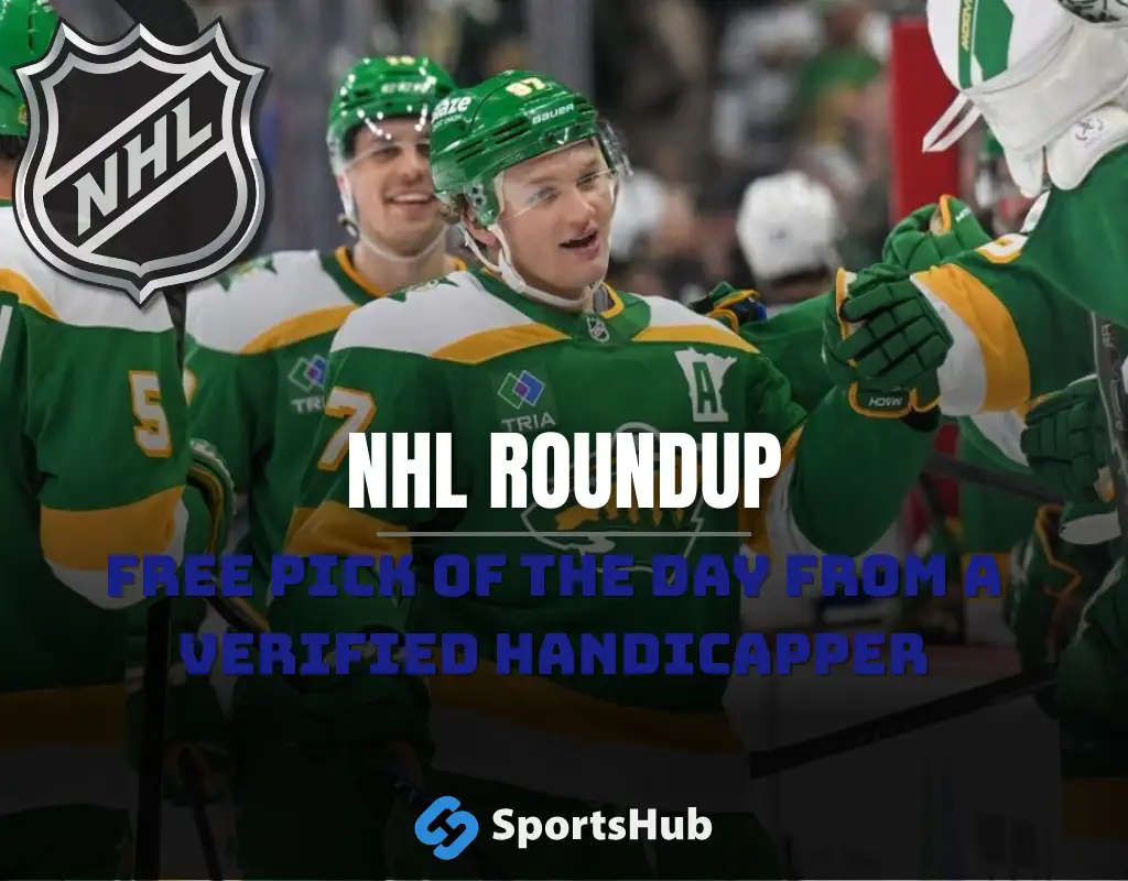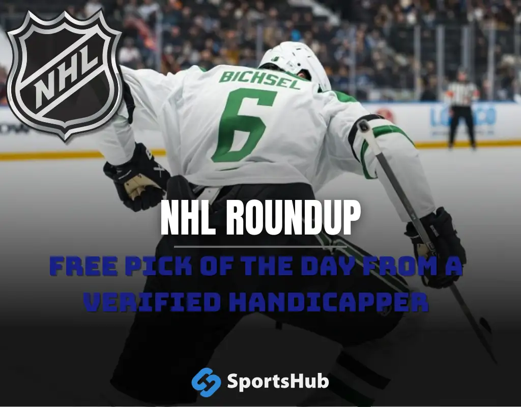 NHL roundup graphic highlighting the Avalanche tying it late and beating the Stars in a shootout, featuring both team logos and Sportshub branding.